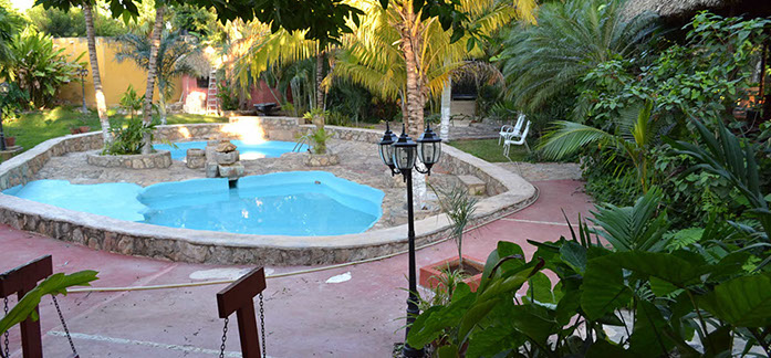 Piscina tipo cenote al aire libre para que refrescarte en compañía de tu familia o compañeros de trabajo. La piscina cuenta con área de chapoteadero de baja profundidad para tu tranquilidad y seguridad de los menores.